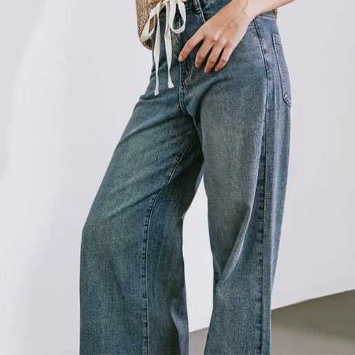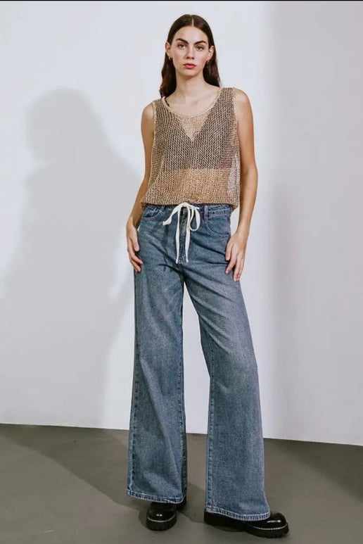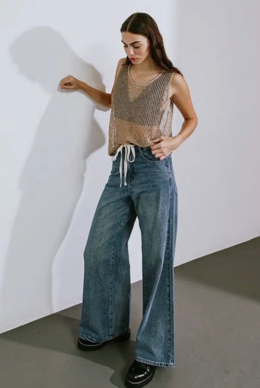 Washed denim with a white drawstring tie in the front. Gives the Jeans a different look that adds uniqueness. The wide leg gives plenty of comfort and movement.