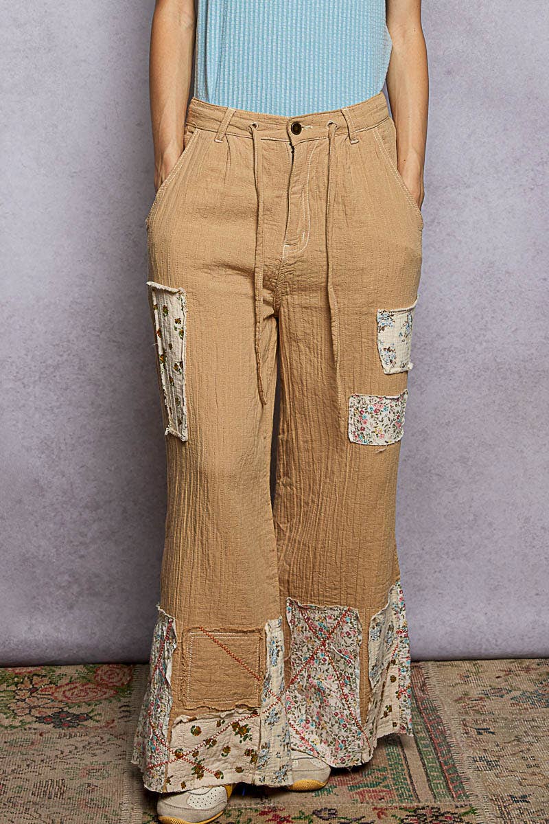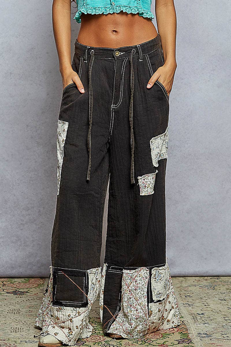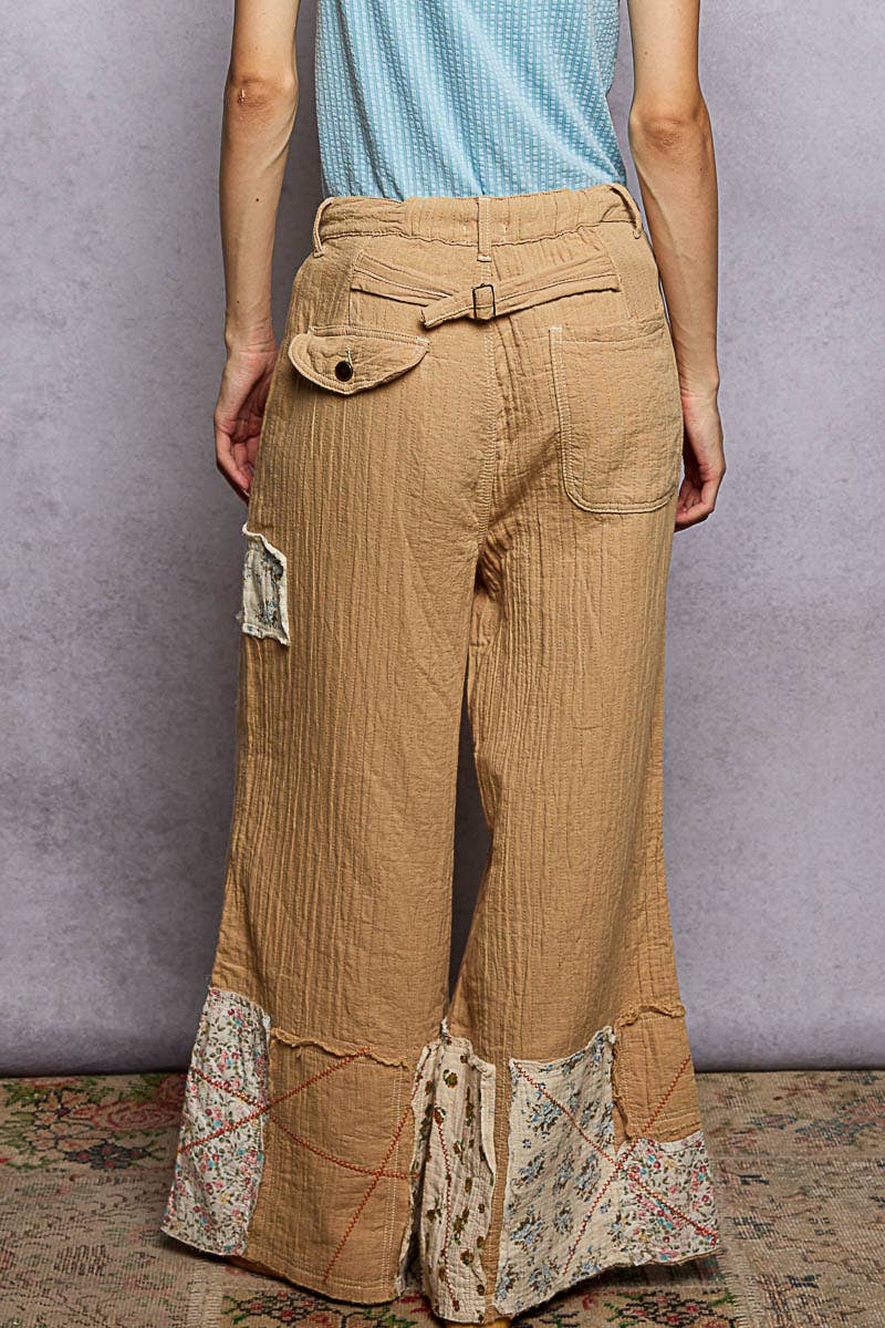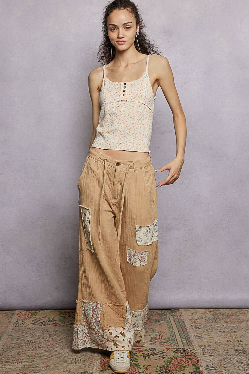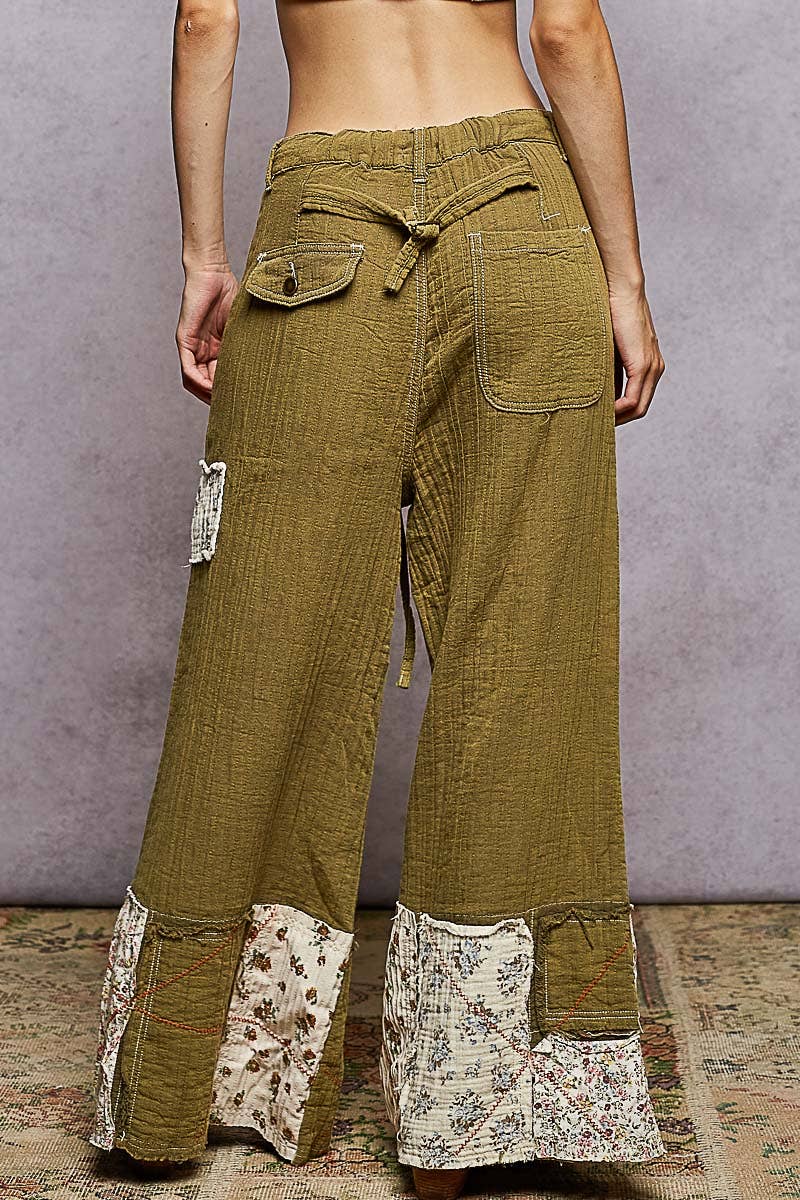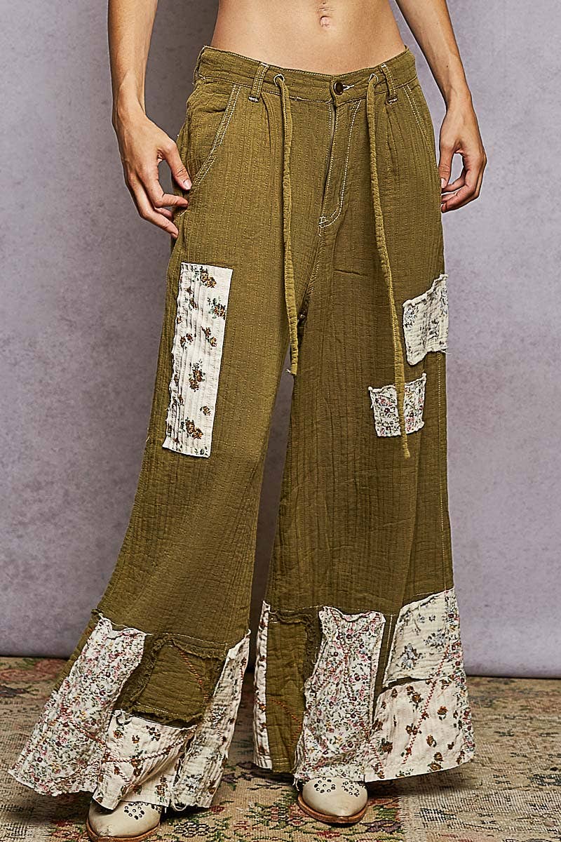 Designed in wide pants in stitched double gauze with print patch, embroidery point, waist loop, vintage washing, solid color.