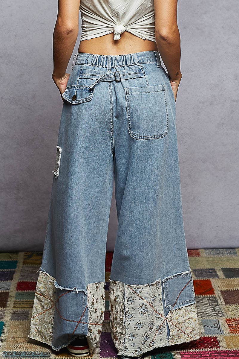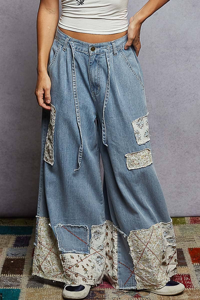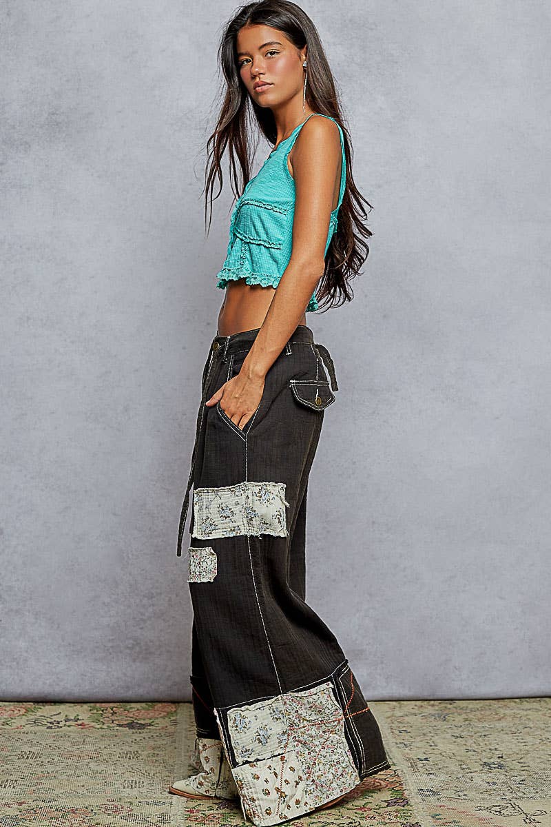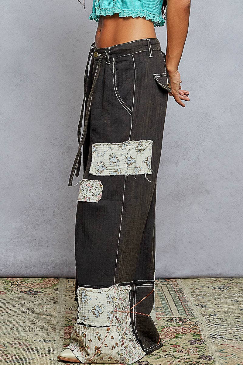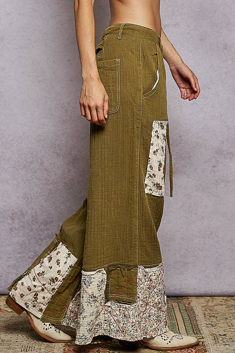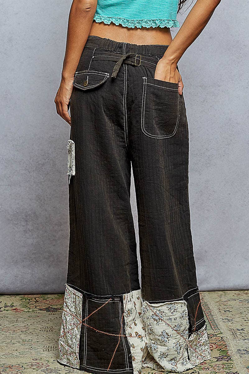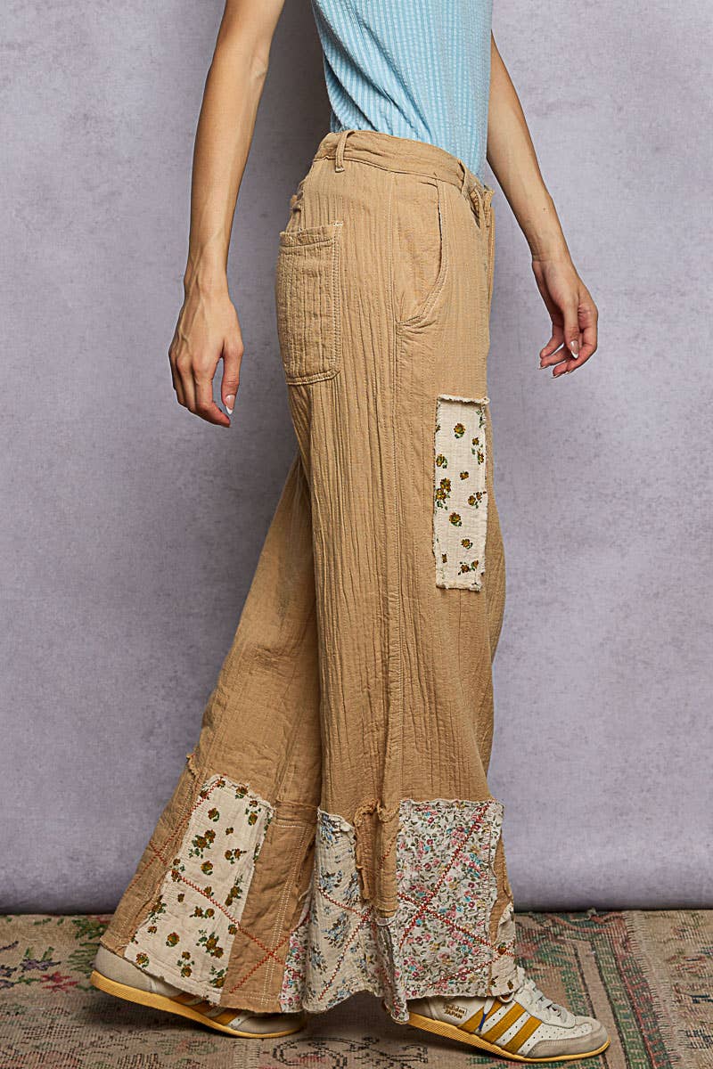 Designed in wide pants in stitched double gauze with print patch, embroidery point, waist loop, vintage washing, solid color.