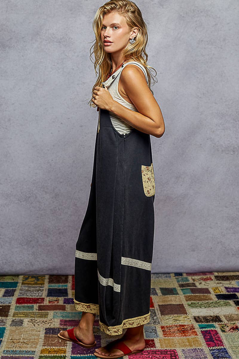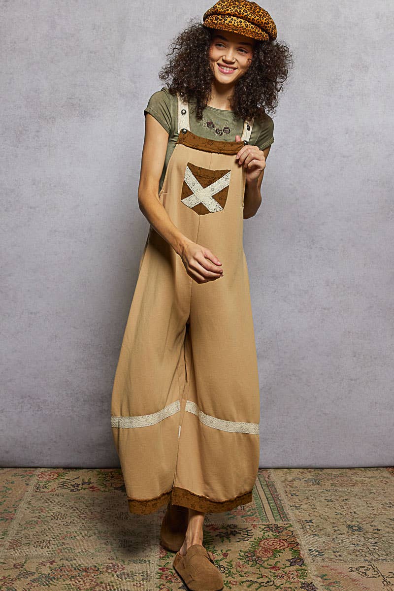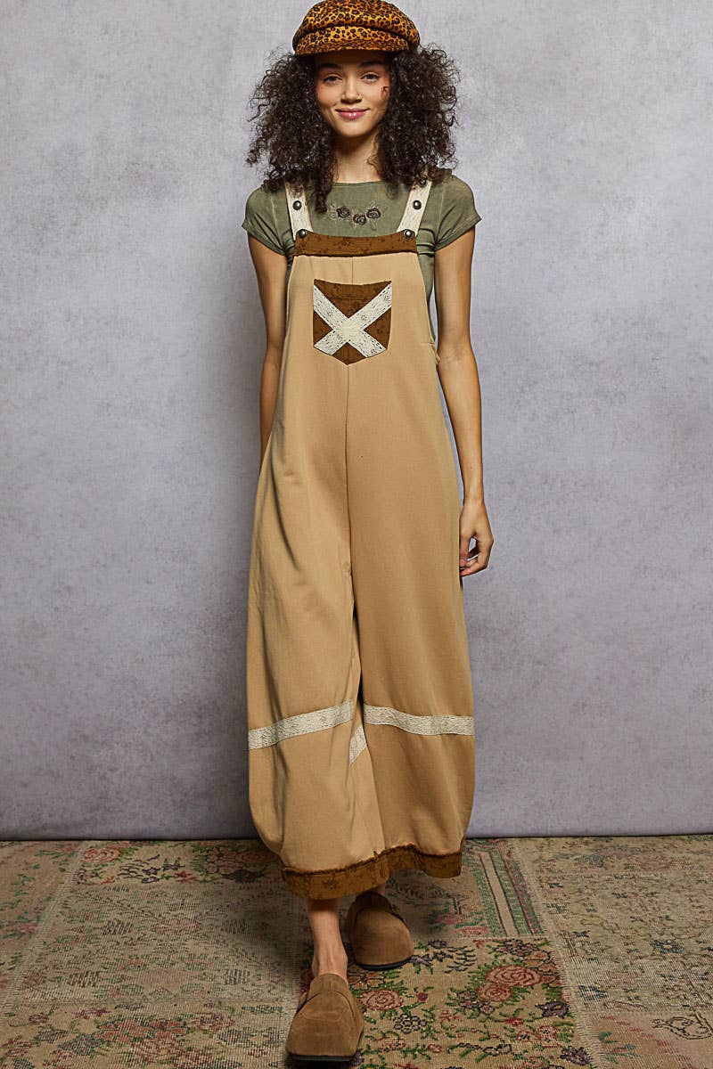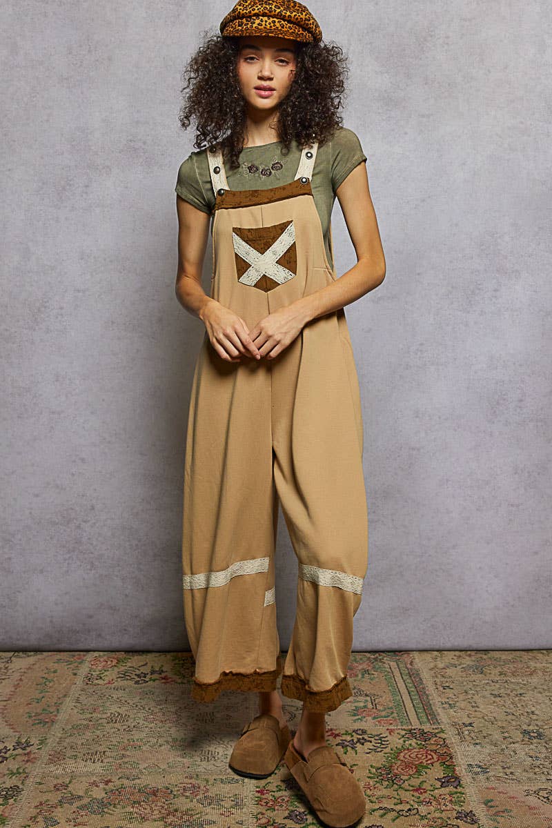 Designed in overall in French terry with print patch, trim point, side pintuck detail, back pockets, outseam, print band leg opening point, side zipper opening, adjustable trim strap, vintage washing, solid color.